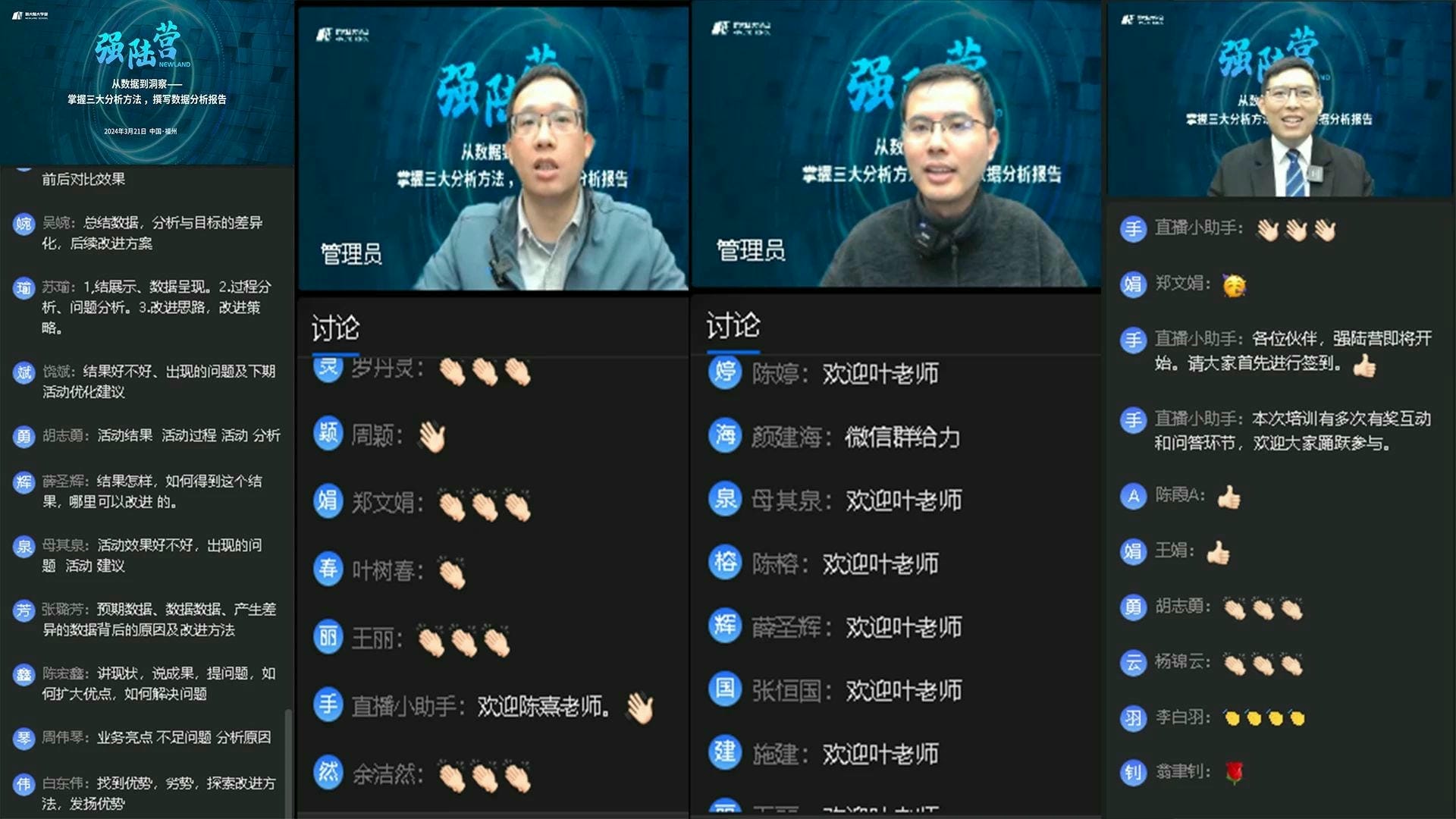為了提升員工的數(shù)據(jù)分析能力,挖掘數(shù)據(jù)中的潛在價值,更深入地掌握數(shù)據(jù)分析技能,為業(yè)務決策提供更加精準的支持,實現(xiàn)數(shù)據(jù)驅動業(yè)務的目標。3月21日,集團人力資源部特別邀請新大陸大學堂內部講師葉欣杰、陳熹,通過線上直播學習和交流互動的形式,旨在通過實戰(zhàn)教學,讓學員們快速掌握三種數(shù)據(jù)統(tǒng)計分析工具,并學會撰寫高質量的數(shù)據(jù)分析報告。此次培訓吸引了集團總部及各經(jīng)營單位的研發(fā)與產(chǎn)品人員共計344人參與報名。培訓當天,互動熱烈。