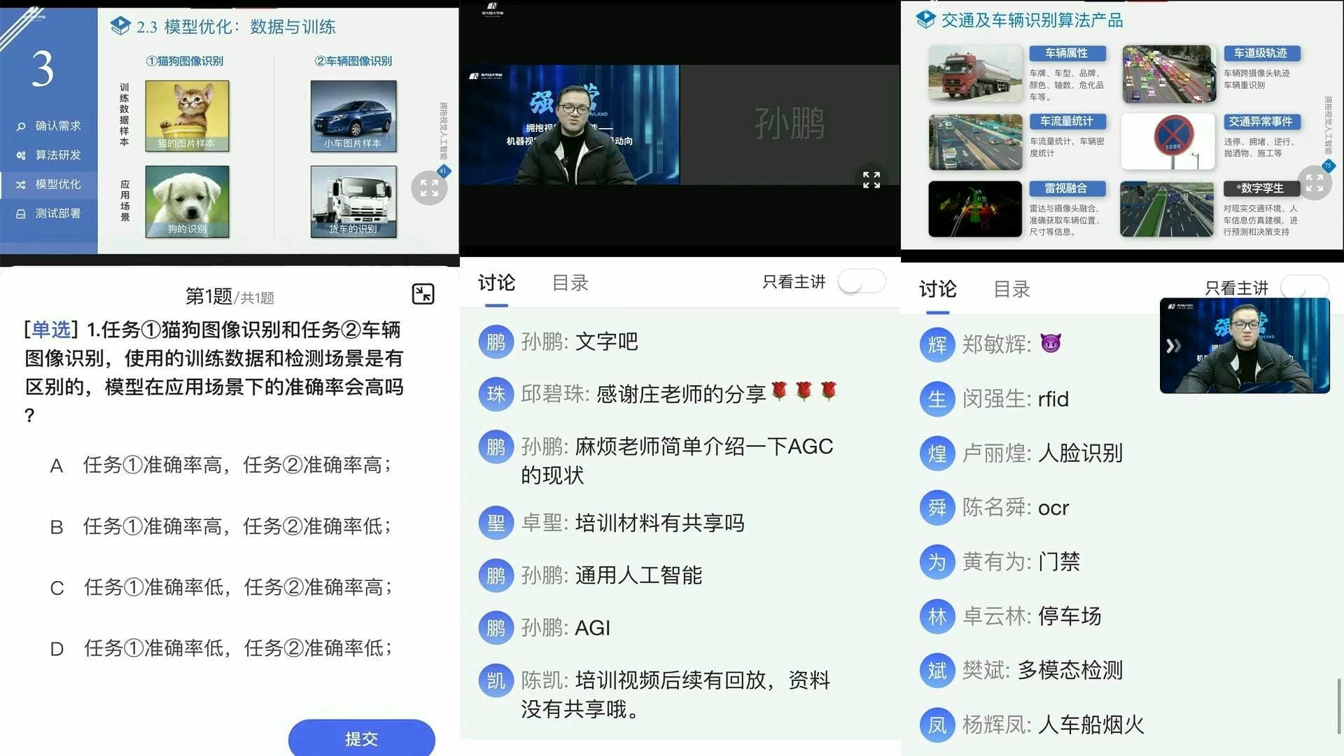 會(huì)上,莊自成講師從人工智能的發(fā)展脈絡(luò)、視覺(jué)產(chǎn)品的研發(fā)過(guò)程、視覺(jué)產(chǎn)品應(yīng)用案例以及大模型、多模態(tài)與AIGC這四個(gè)方面,為學(xué)員們理清了人工智能的發(fā)展脈絡(luò)。同時(shí),他將視覺(jué)產(chǎn)品的研發(fā)過(guò)程細(xì)分為四個(gè)階段,分別是確認(rèn)需求、算法研發(fā)、模型優(yōu)化和測(cè)試部署。此外,莊自成還深入淺出地介紹了機(jī)器視覺(jué)的核心原理和技術(shù),結(jié)合實(shí)際項(xiàng)目案例,生動(dòng)展示了機(jī)器視覺(jué)技術(shù)在工業(yè)檢測(cè)、智能交通、安防監(jiān)控等領(lǐng)域的應(yīng)用,使學(xué)員對(duì)機(jī)器視覺(jué)技術(shù)有了更直觀、更深入的理解。最后,莊自成分享了視覺(jué)AI的前沿動(dòng)向,詳細(xì)介紹了大模型、多模態(tài)和AIGC的概念以及它們?cè)趯?shí)際項(xiàng)目中的應(yīng)用,為學(xué)員們提供了不一樣的解決問(wèn)題的思路。莊自成鼓勵(lì)學(xué)員們大膽使用AIGC工具,了解人工智能應(yīng)用,擁抱人工智能時(shí)代。