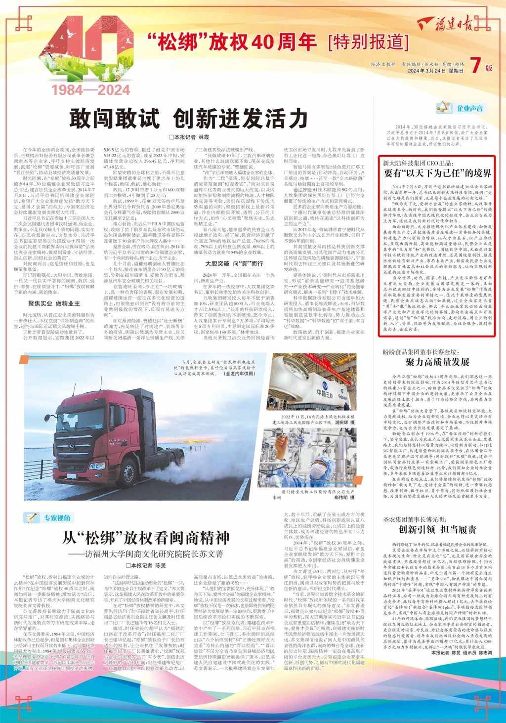1984年3月24日,福建55名廠長、經理聯名發(fā)出《請給我們“松綁”》的呼吁信,成為我國“經濟體制改革的一段佳話”。2014年,30位福建企業(yè)家致信習近平總書記。習近平總書記于2014年7月8日回信,給廣大企業(yè)家以極大的鼓舞和鞭策。從“敢為人先”到“勇于擔當”,四十年來,福建企業(yè)家傳承發(fā)揚愛拼會贏的精神,挺立創(chuàng)新發(fā)展潮頭,譜寫出新福建改革創(chuàng)新、轉型升級的新篇章。