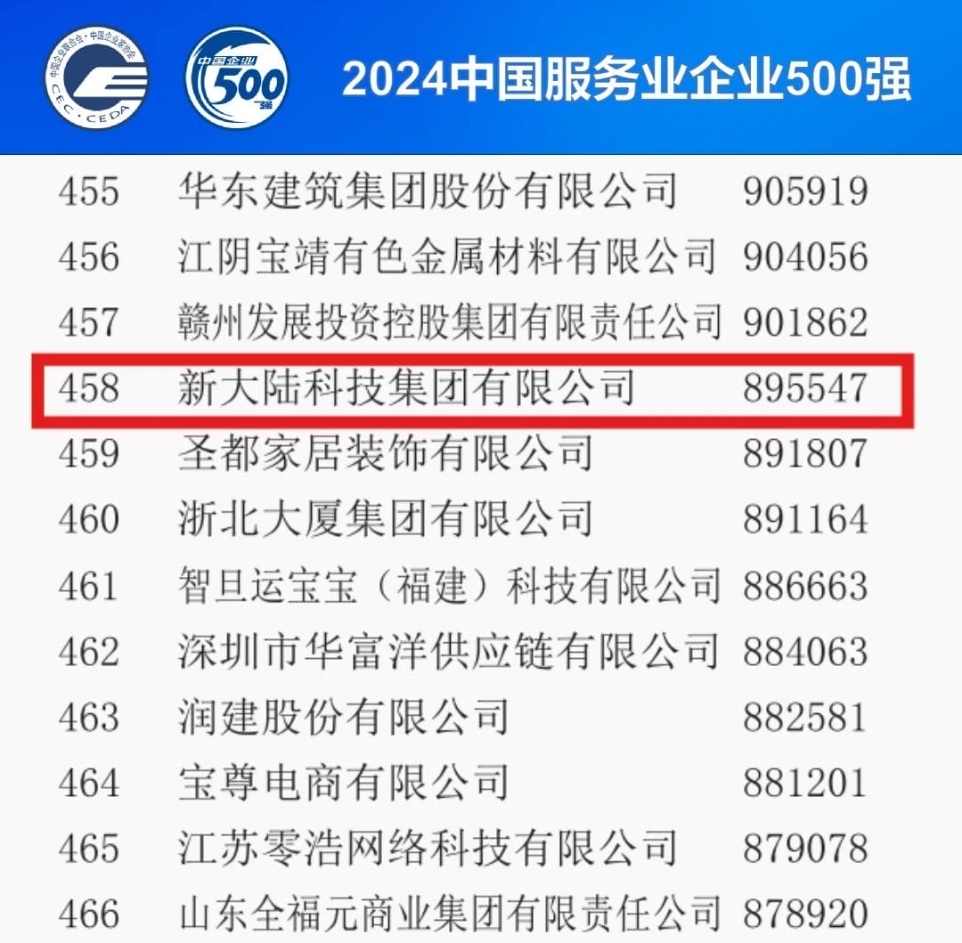 9月11日,以“向‘新’而行 打造更多世界一流企業(yè)”為主題的“2024中國500強企業(yè)高峰論壇”在天津市舉行。會上,中國企業(yè)聯(lián)合會、中國企業(yè)家協(xié)會發(fā)布了2024中國服務(wù)業(yè)企業(yè)500強相關(guān)榜單及其分析報告。新大陸連續(xù)五年躋身500強行列。入選企業(yè)還有國家電網(wǎng)、中國工商銀行、中國建設(shè)銀行等。