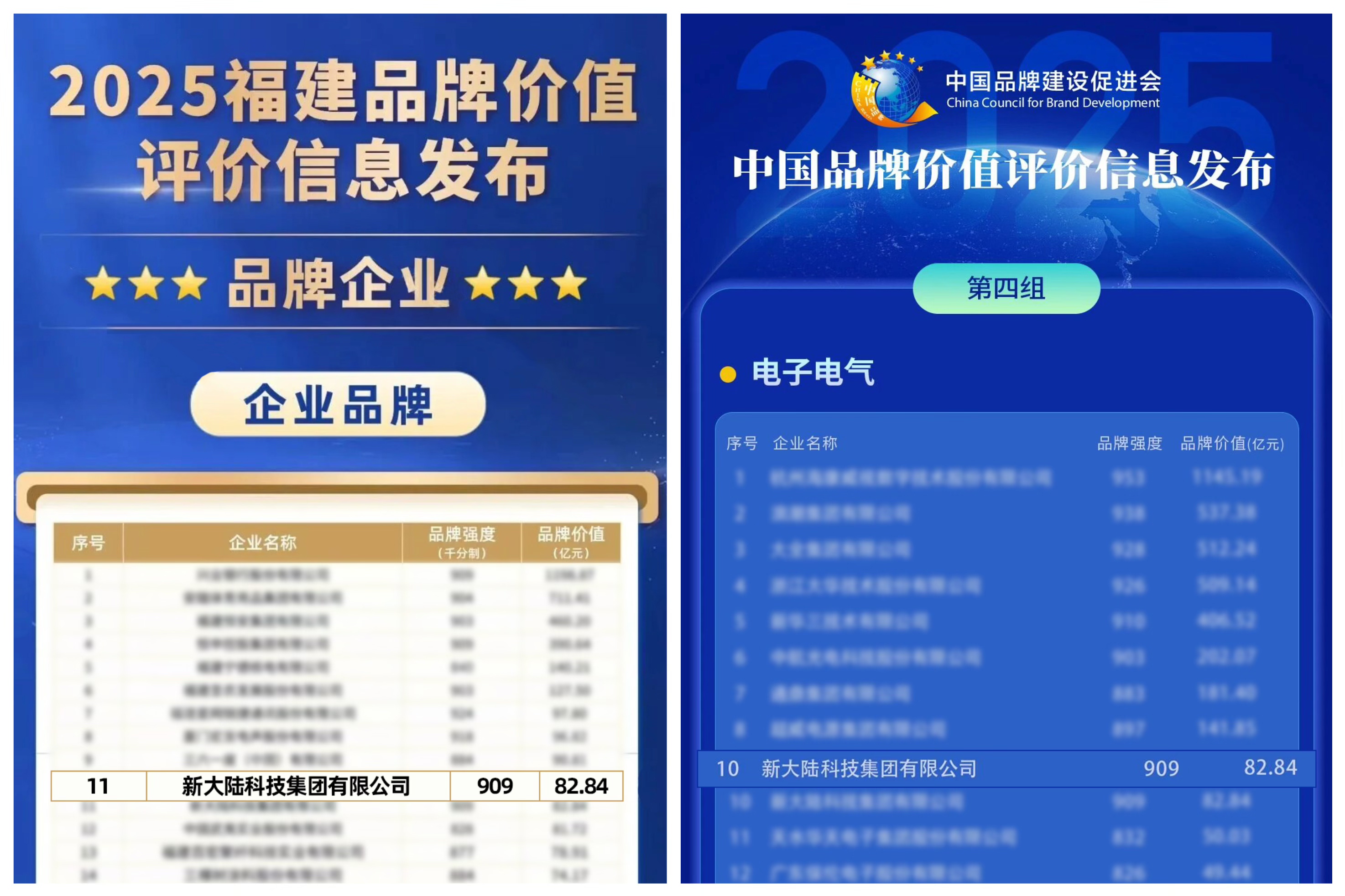 近日,2025“中國(guó)品牌價(jià)值評(píng)價(jià)信息”和“福建品牌價(jià)值評(píng)價(jià)信息”發(fā)布。新大陸再度上榜,位列中國(guó)電子電氣領(lǐng)域第十,福建品牌百?gòu)?qiáng)、企業(yè)品牌類第十一。