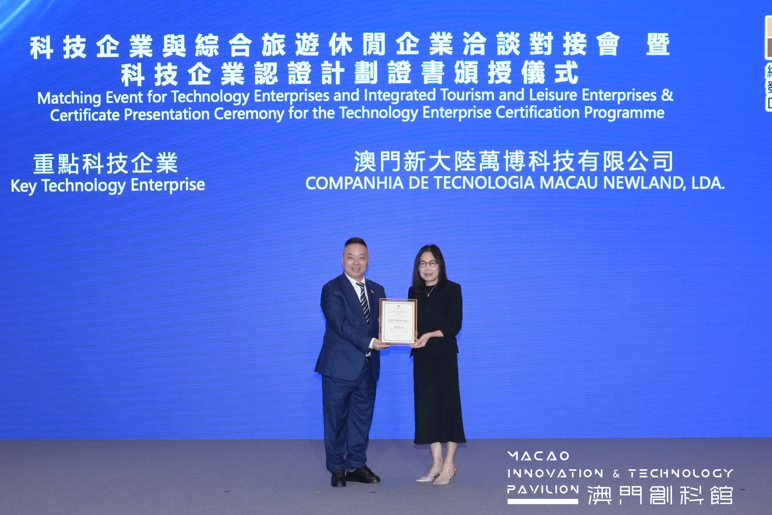 12月5日,由澳門(mén)特區(qū)政府經(jīng)濟(jì)及科技發(fā)展局(下稱"經(jīng)科局")和科學(xué)技術(shù)發(fā)展基金共同主辦的"科技企業(yè)與綜合旅游休閑企業(yè)洽談對(duì)接會(huì)暨科技企業(yè)認(rèn)證計(jì)劃證書(shū)頒授儀式"在澳門(mén)威尼斯人酒店舉行。經(jīng)過(guò)嚴(yán)格篩選與評(píng)審,澳門(mén)新大陸萬(wàn)博成功獲評(píng)為《科技企業(yè)認(rèn)證計(jì)劃》——"重點(diǎn)科技企業(yè)"。經(jīng)科局代局長(zhǎng)鄭曉敏為獲認(rèn)證企業(yè)頒獎(jiǎng),公司總經(jīng)理劉金東出席儀式并領(lǐng)取證書(shū)。
