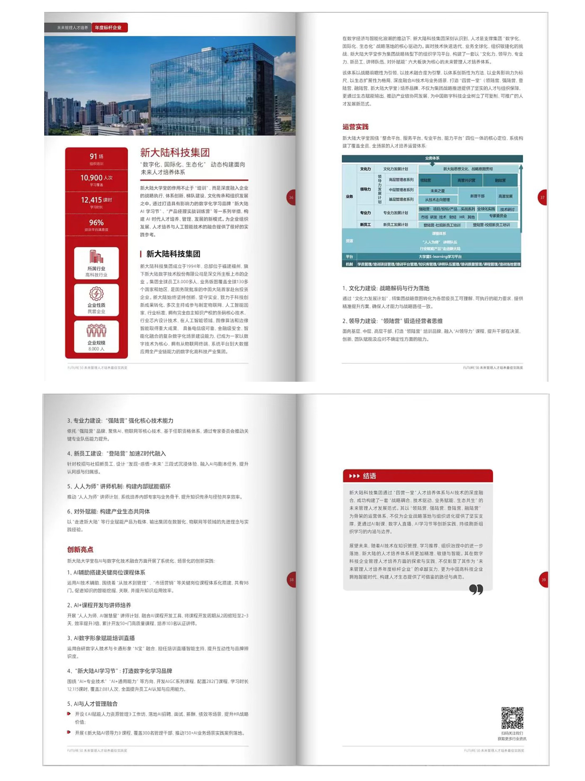 本屆評選同步推出年度精選案例集,新大陸圍繞 “四營一堂” 搭建的人才培養(yǎng)體系、AI 技術(shù)與業(yè)務(wù)場景的融合實踐,憑借突出的可復(fù)制性與落地價值成功入選,相關(guān)實踐經(jīng)驗在案例集中以 4 頁篇幅進行深度收錄,成為行業(yè)人才培養(yǎng)的重要參考范本。